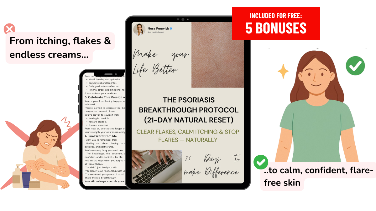 A proven 21-day plan to calm inflammation, stop psoriasis flare-ups, and restore clear, healthy skin naturally—without steroids or harsh treatments. Includes the complete protocol plus 5 expert bonus guides for lasting results.
